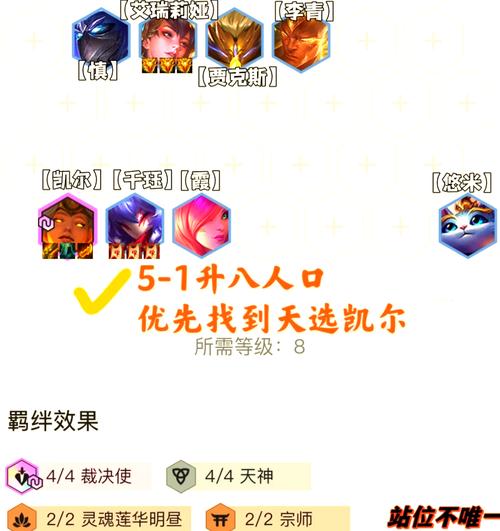 〖Two〗、在《金铲铲之战》S8赛季中,登神天使阵容是一种高效的上分策略。这套阵容属于D卡流,主要通过连败策略进行前期运营。一旦在3-1阶段搜到3星天使,就基本奠定了胜利基础,关键点在于利用登神长阶和高决斗羁绊。