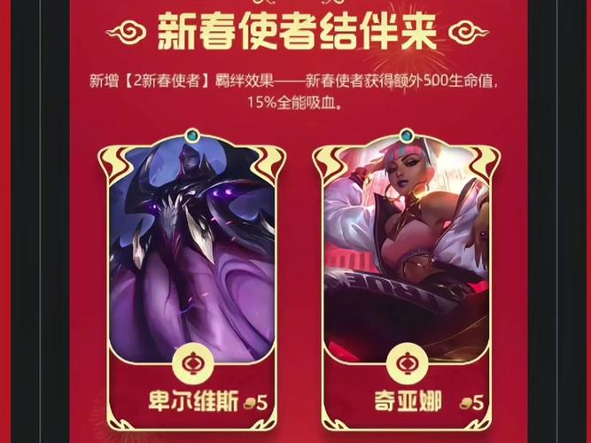 〖Four〗、当激活“2新春使者”羁绊后,场上的新春使者单位将获得500点额外生命值和15%的全能吸血效果。这一羁绊效果能够大幅提升新春使者的坦度、生存能力和续航能力。因此,虽然云顶之弈本身没有新春使者的概念,但在金铲铲之战中,你可以体验到新春使者带来的独特效果。