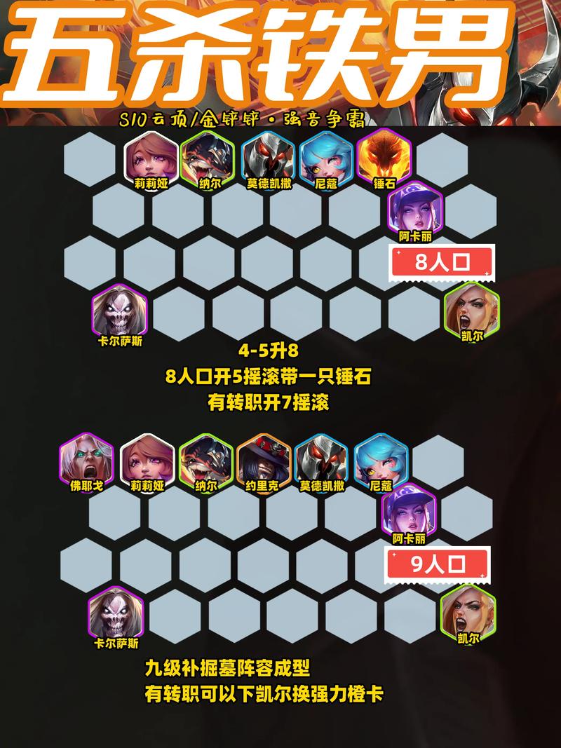 八黎明使者阵容 阵容组成:卡尔玛、锐雯、豹女、螳螂、盖伦、酒桶、奶妈、千珏。 阵容羁绊:8黎明使者1永烈双子1神王。需要通过金铲铲和巨人腰带合成黎明使者转职,给到千珏以凑出8黎明使者羁绊。 阵容运营:前期选取破败过度,破败低费卡居多,质量容易提升。