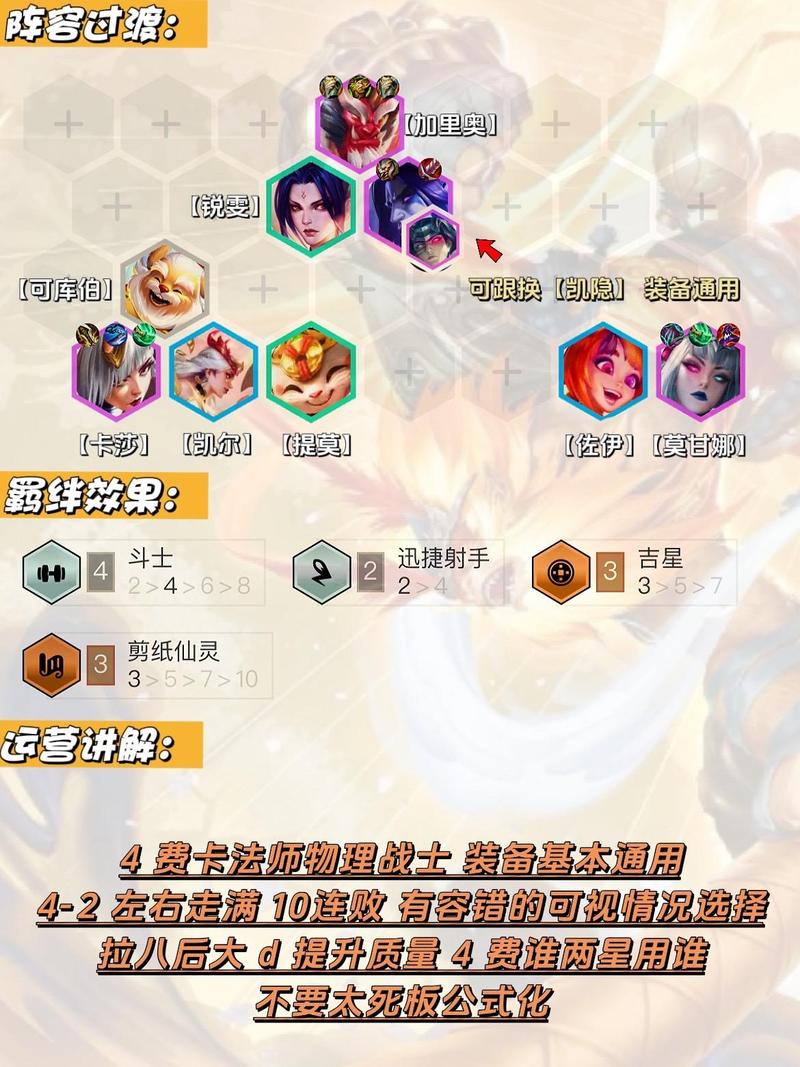 运营思路需注重前期,开局优先抢大剑与大棒,以便制作科技枪、传送门等关键装备。若无塔姆带福星,可选取其他过渡阵容如四挑战、三国神射、四斗士等。前期避免卖血,保持血量,优先收集天选福星牌。中期过渡至三福三国拼多多,确保卡特、安妮与金克丝的装备,等待天选福星的出现。