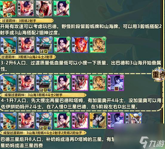 阵容 组成:希维尔、妮蔻、瑞雯、巴德、塔姆、佐伊、索拉卡 羁绊:3剪纸仙灵3山海绘卷2迅捷射手2斗士2天将2法师2武仙子 装备 佐伊:羊刀青龙刀,帽子,法爆,鬼书,巨杀,蓝霸符等 塔姆:龙牙,反甲,狂徒,板甲,心之刚,救赎,备选冕卫,头盔 巴德:鬼索+科技刀。