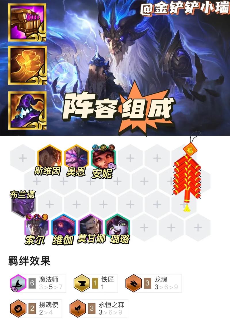 羁绊:龙魂是瑞兽闹新春新推出的大型羁绊。它是一个3/6/9弈子的新羁绊,因此全龙魂阵容也是OK的(而且无用大棒+金铲铲现在可以合成龙之魂灵)。