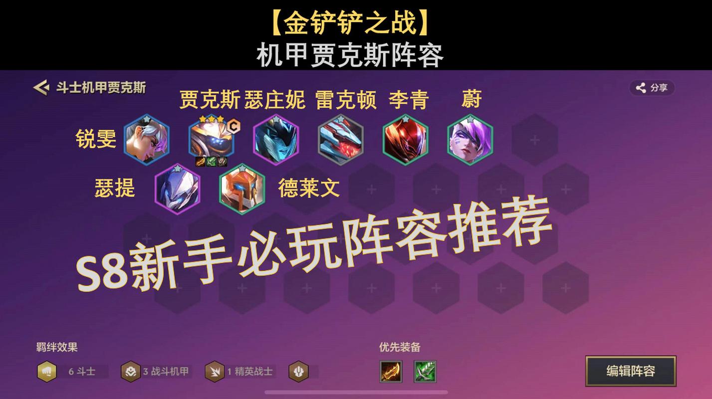 在金铲铲之战s8赛季中,贾克斯阵容是由5战斗机甲、4斗士、2护卫、2秘术卫士、1精英战士组成。这样的阵容配置使得贾克斯在战场上拥有强大的生存能力和输出能力。强化符文方面,我们首选狩猎律动背水一战、无情连打,次选飞升、星界赐福万用瞄准镜珠光莲花。