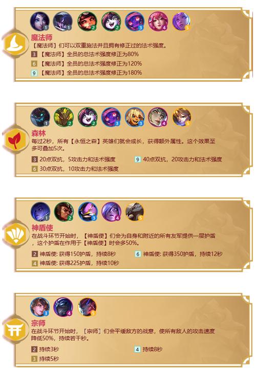 宗师 效果:在战斗开始时,宗师会降低敌人50%攻击速度.『2』 持续3秒 『3』 持续5秒 『4』 持续8秒 重装战士 效果:重装战士们获得额外护甲。『2』 100护甲 『4』 200护甲 『6』 500护甲 月神 效果:把星级最低的月神英雄增加1星,如果等级一样那么就选装备比较多的。