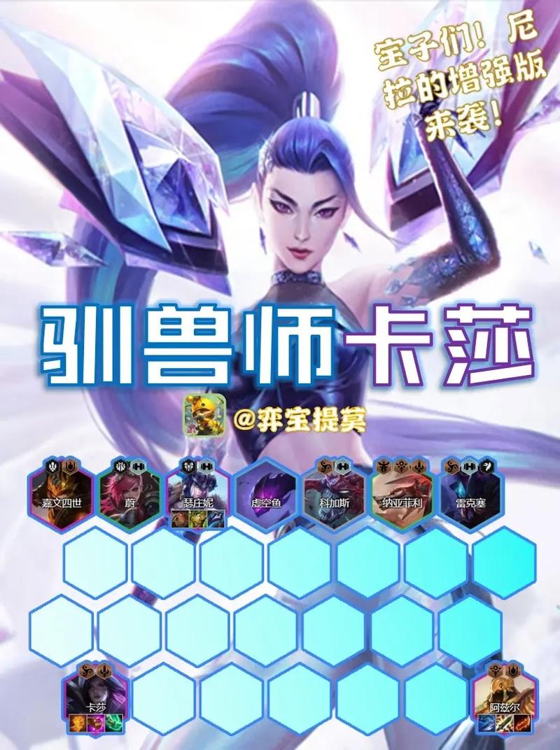 阵容由“尼菈”“卡特琳娜”“阿卡丽”“卡莉斯塔(狂暴转职)”“剑姬”“格温”“慎”“人马”组成,八人口达大成的阵容,而且没有五费卡,还是比较好成型的。阵容刚需狂暴转职,不然在后期的战力替补上来,推荐在开局有狂暴转的情况下再玩。