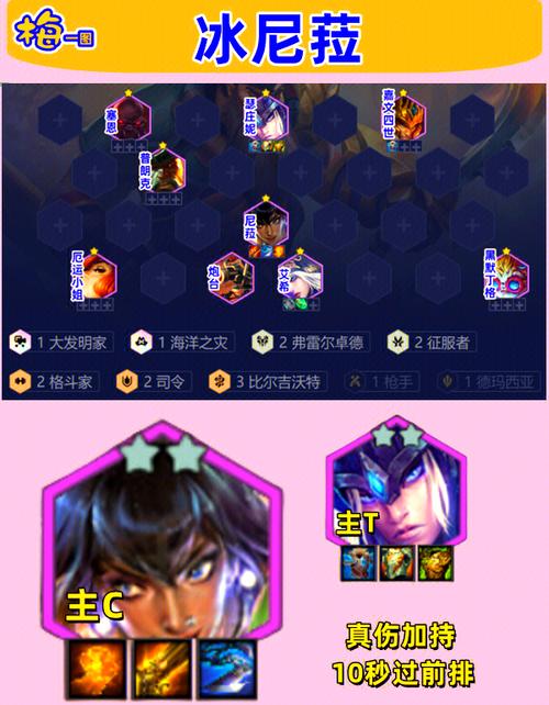 尼菈是阵容的主要核心,所有羁绊都是围绕着尼菈来搭配,主宰的减伤效果、司令的护盾可以在前排抗伤,让尼菈更轻松的叠加攻速。有主宰转职可以开6主宰;有比尔转职可以开5比尔或7比尔。出装与符文 尼菈出装推荐双火炮+汲取剑。