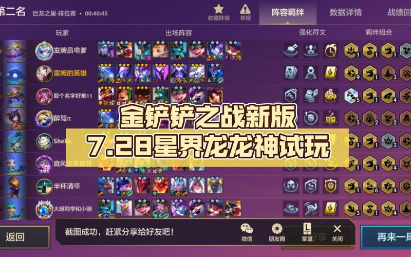 在金铲铲之战S7赛季中,推荐玩星界龙王阵容,由9星界龙、1龙神、2格斗家组成。强化符文方面,优选星界赠礼、DD街区、存心失利,备选飞升、卢登的回声好事成双2。主C龙王的必备装备是青龙刀、海克斯科技枪刃,替代装备可选取大天使之杖、班克斯的魔法帽、珠光护手。