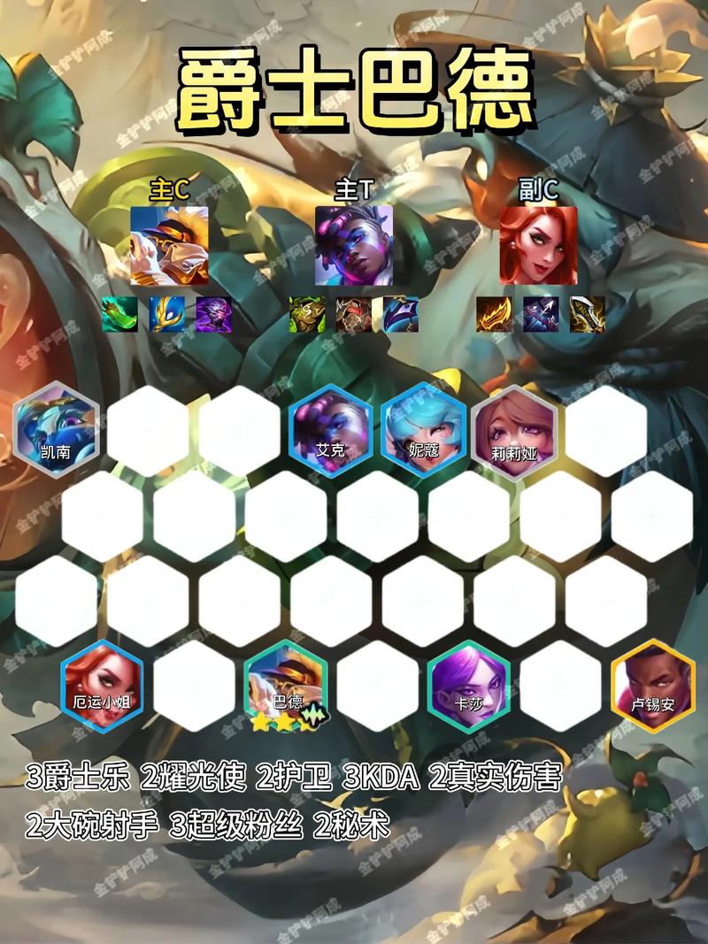 〖Two〗、金铲铲之战s10爵士拼多多阵容的玩法如下:阵容构成:所需弈子:巴德、艾克、厄运小姐(女枪)、娑娜(琴女)、妮蔻、璐璐、卡莎、凯南、莉莉娅。组成羁绊:1 DJ娑娜、3爵士乐、3KDA、3法师、3超级粉丝、2真实伤害、2大腕射手、2护卫、2秘书护卫、1高能流行。