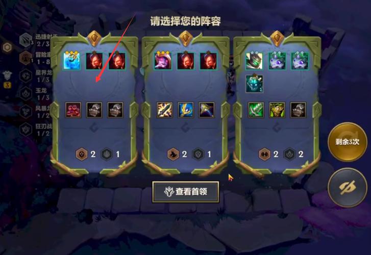 阵容选取:阵容上选取第三套阵容,即执法官狙神阵容。海克斯的选取:海克斯选取星界赐福,以此来保证英雄的生存能力。第一关如下图站位即可,输出放后排,坦克放前排,装备可以不放,直接就可以过关。第二关选取最后一个三挑战阵容,与剑姬激活4挑战。