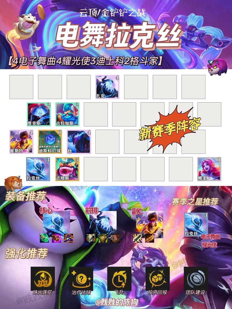 《金铲铲之战》星界拉克丝玩法攻略【阵容简介】星界体系现在玩的人相对较少,只要不是强玩,拉克丝3星快吃分非常稳定,8星界与星界拉克丝属于一套体系主要是看有没有法转。有法转可考虑星界5法,在9人口在上索尔,韦鲁斯在带法转的情况下控制能力逆天,哪怕后期不上索尔也是能吃鸡的。
