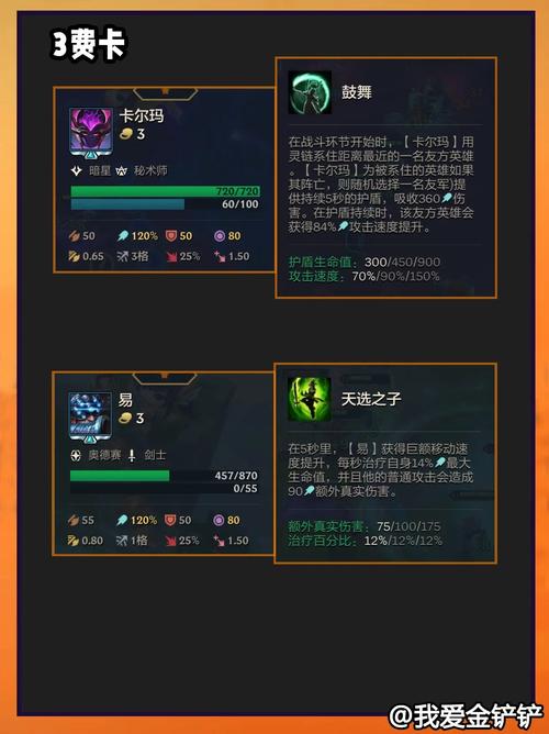 〖Six〗、金铲铲之战s5卡尔玛的玩法主要包括技能利用、羁绊搭配以及属性理解:技能利用- 技能效果:卡尔玛的技能“鼓舞”能为距离最近的友方英雄提供护盾和攻击速度加成。如果被系住的英雄阵亡,则会随机选取另一名友军提供同样的效果。