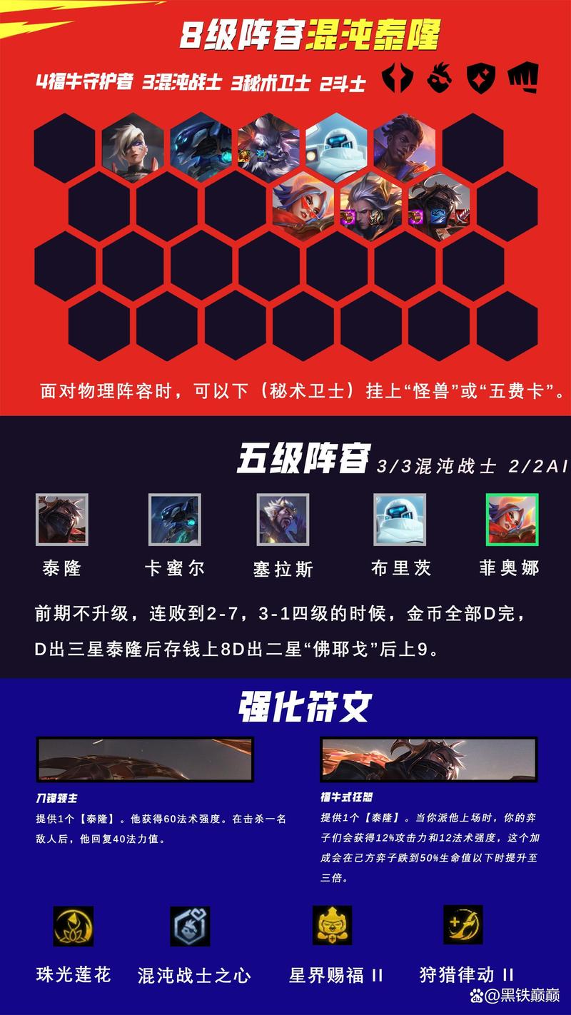 〖One〗、组成。阵容组成:泰隆、塞拉斯、卡密尔、阿利斯塔、佛耶戈、蕾欧娜、迦娜、厄斐琉斯、费德提克。阵容羁绊:6混沌4福牛2秘术1平民1枪神1怪兽。转职推荐:福牛纹章、混沌纹章。阵容优点:过渡丝滑,6混沌伤害居高,中期锁血能力强。如果没有混沌纹章也可以转3混沌拼九五思路。