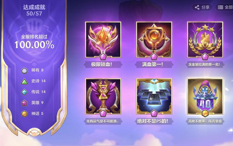 〖Three〗、金铲铲之战成就大全:成就玩法是金铲铲之战s5赛季新出的玩法,一共有5个成就等级,从低到高分别为稀有、史诗、传说、英雄、神话。英雄成就汇总:金闪闪的快乐:单人排位模式上阵至少一名3星橙卡并且获得第一名。(紫色成就)多多益善:匹配/排位模式至少10人口并且获得第一名。
