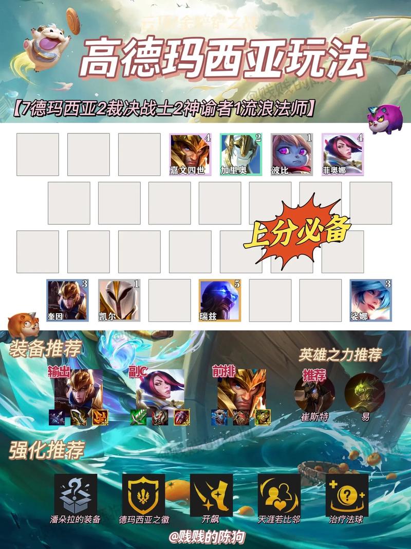 〖Four〗、金铲铲之战s10双喜裁决阵容搭配如下:阵容组合:裁决赛季之星:潘森、双老鼠(图奇)、双薇古丝、双阿木木、阿卡丽/死歌。羁绊为4裁决、2EMO、2护卫、2朋克。护卫赛季之星:潘森、双老鼠、双薇古丝、双阿木木、锤石。羁绊为4护卫、2EMO、2朋克、2裁决。