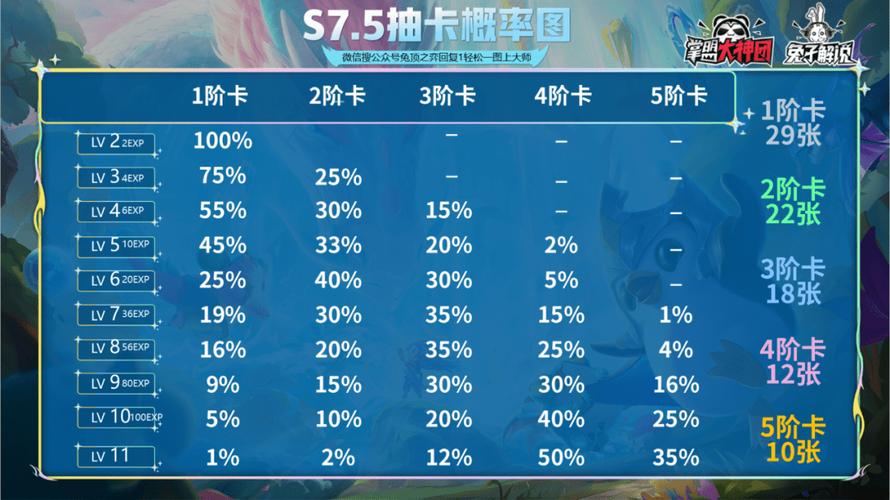 〖One〗、抽卡 『1』抽卡几率:二级:1费用几率100%。三级:1费用几率75%、2费用几率25%。四级:1费用几率50%、2费用几率30%、3费用几率20%。五级:1费用几率50%、2费用几率33%、3费用几率25%、4费用几率2%。六级:1费用几率25%、2费用几率40%、3费用几率30%、4费用几率5%。