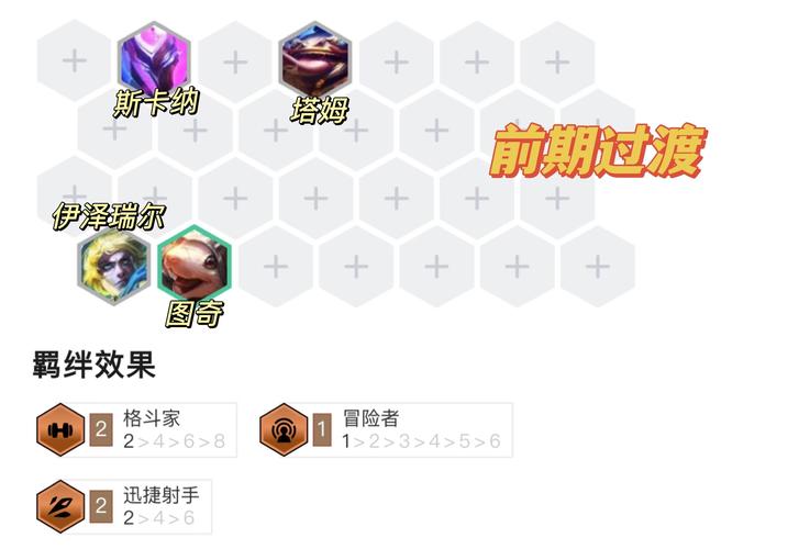 阵容是在7人口慢D三星,所以前期可以根据自己的嫖牌来选取过度阵容,斗射,护卫炮,永恩等过度都是不错的选取。,一般7人口之前不D牌,存钱到7口人梭哈找出一只石傲玉跟奥恩,其他全二星就能存钱慢D三星。沃利贝尔三星后就上8人口补露露,9人口上巴徳。