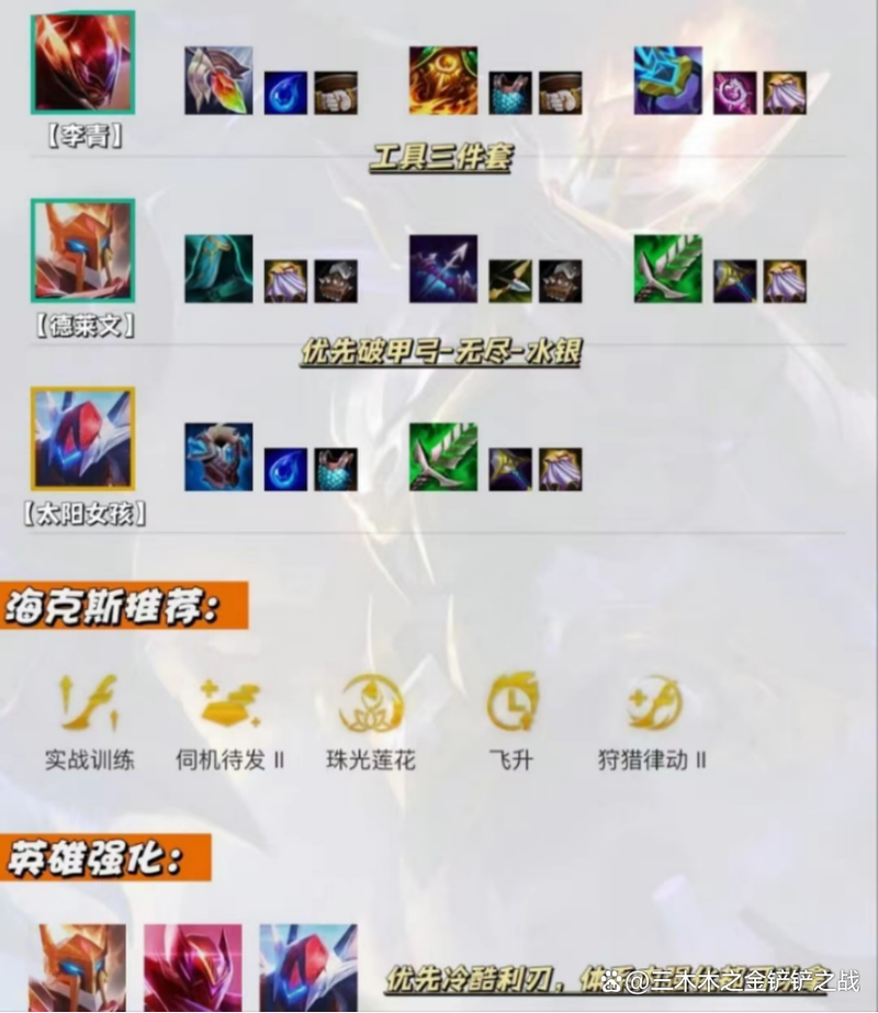 〖Four〗、海克斯强化选取 优先考虑精密魂和白魔冕,它们能帮助队伍获得额外金币及增加白魔效果。根据游戏进展,可选取适合当前局面的海克斯强化。装备分配 德莱文作为主C,装备推荐无尽、轻语、巨杀。副C蕾欧娜则装备救赎、石像鬼的板甲、水银,剩余装备可为烬准备伏击与旗子。