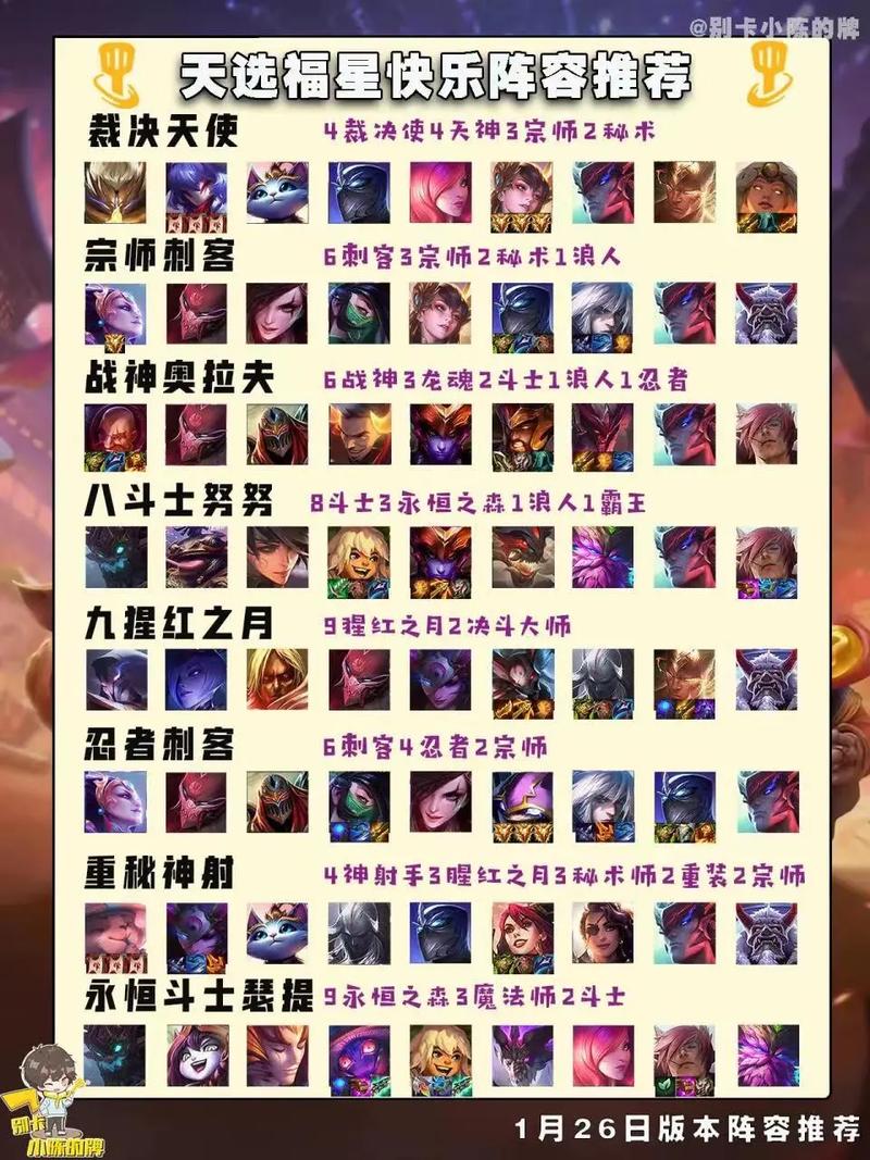 〖Three〗、阵容搭配:福星神射阵容的核心在于利用福星和神射手的羁绊效果。常见的搭配有安妮、猪妹、塔姆、卡特、金克丝、烬、提莫等英雄。这些英雄能够形成强大的前排坦克和控制能力,同时通过后排的神射手进行高爆发输出。装备选取:对于主要输出英雄,如金克丝和烬,需要选取合适的装备以提升其输出能力。