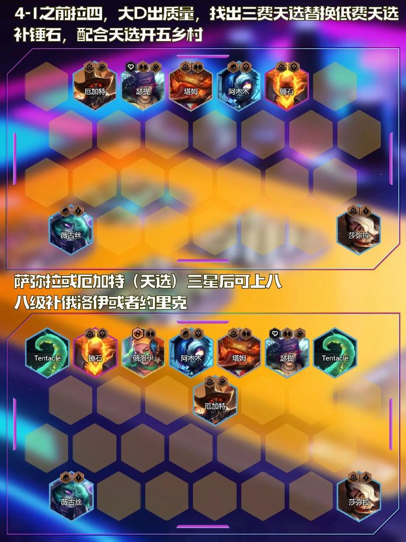天选找任意天选厄加特即可,舞者羁绊也是可以不用转职就能开到比较高的6舞者,所以天选是哪个羁绊不那么挑剔。舞者天选也可以放弃乡村加成去找死歌开五杀羁绊也是可以的。2-1拉4,开局可以纳尔搭配舞者蔚一起过度,能开超级粉丝就开超级粉丝搭配天选过度,没有就朋克搭配纳尔等一起过度也是可以的。