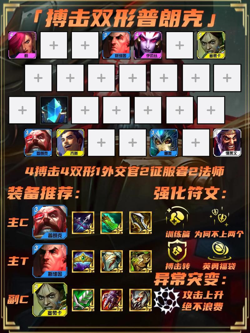 阵容与羁绊搭配 阵容:蛮王、德莱文、蔚、狼人、卡莎、EZ、扎克、塔姆、猪妹。这个阵容以德莱文为核心输出,其他英雄则提供控制和坦度,确保德莱文能够安全输出。羁绊:4格斗家、4挑战者、3炼金科技、2执法官、1宿敌、1食神。这些羁绊能够大幅提升德莱文的攻击力和生存能力,同时增加团队的整体战斗力。