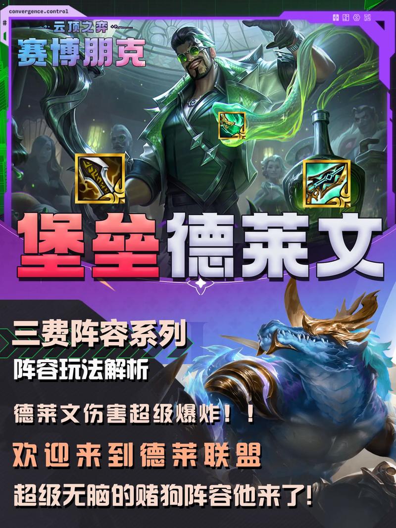 阵容体系与装备适配德莱文主C有两种主流玩法:赌家人体系:成型羁绊为4搏击3家人,适合德莱文数量较少时5人口D牌追三星。此体系中,范德尔作为前排需肉装(如狂徒、龙牙)支撑,德莱文则以羊刀、无尽、轻语为核心,利用家人羁绊的攻速加成强化输出。征服者体系:德莱文速三后拉人口,成型开6征服者4搏击。