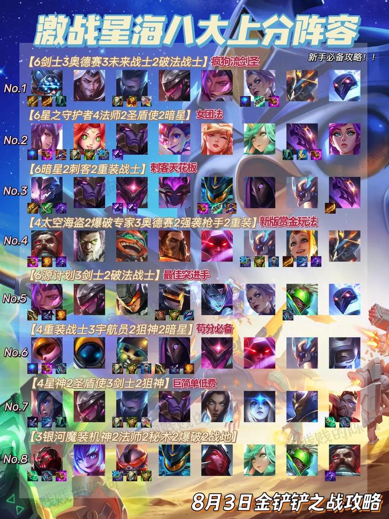 〖Three〗、主流阵容:星际探险者+神盾侠 核心英雄:星陷者席瓦娜、神盾侠卡尔、星陷者拉克丝 核心装备 席瓦娜:鬼索的狂暴之刃、正义之手、海克斯科技枪刃 卡尔:守护天使、电刃、统御烙印 拉克丝:破败王者的战争之刃、无尽之刃、巨龙之爪 游戏策略 早期以寻找核心英雄为主,尽量保持经济的高效运作。