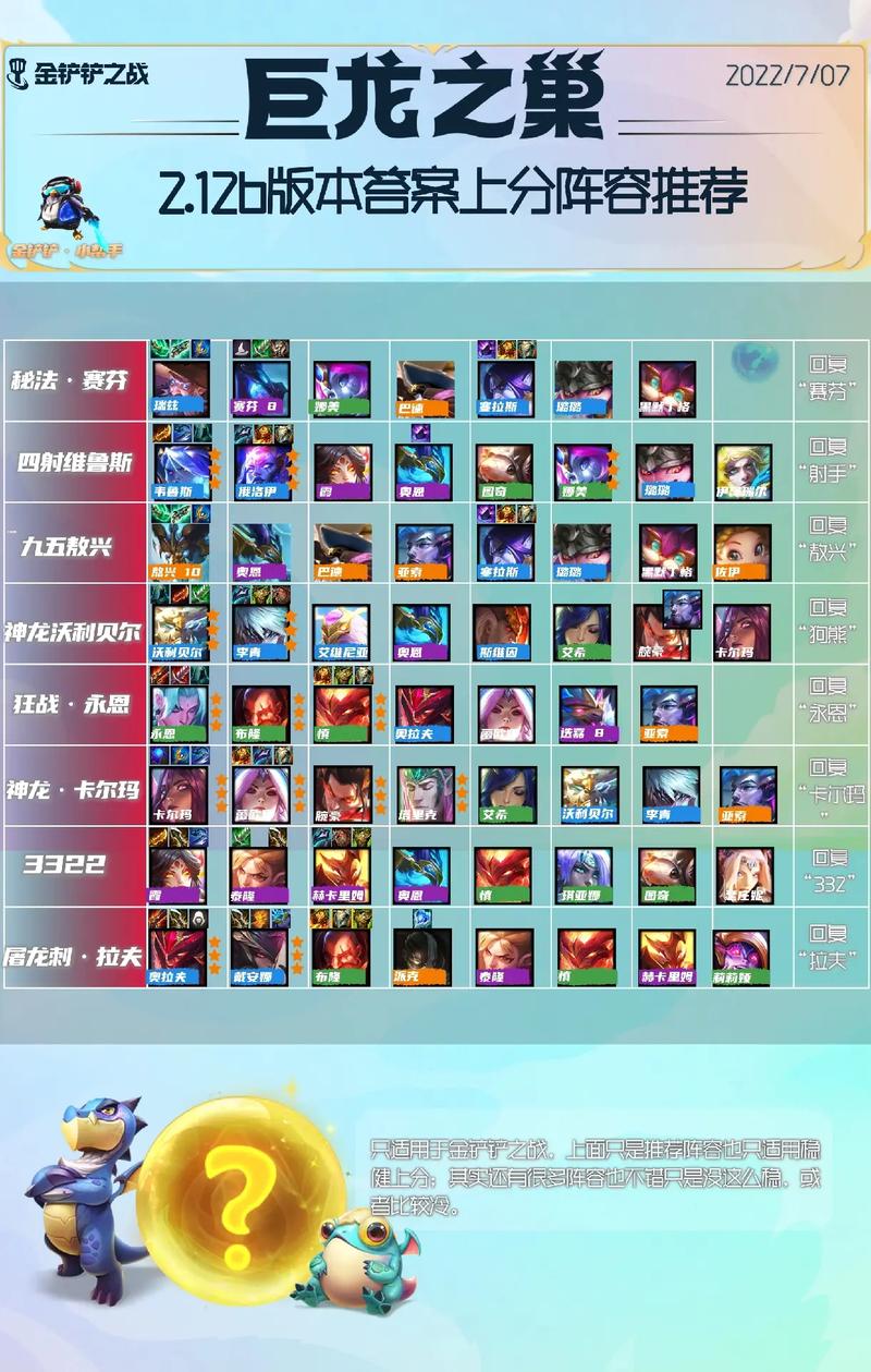 〖Four〗、金铲铲之战巨龙之巢最强阵容推荐:阵容组成:塔姆、慎、赛娜、璐璐、崔丝塔娜、铠隐、金克丝、库奇 搭配的羁绊:4强袭炮手、3神龙烈焰、3怒翼龙、2驯龙大师、2格斗家 当然,此阵容后期也可以稍微调整一下,比如,决赛如果发现对手是法系输出,可以下掉一个强袭炮手,换上巴德,搭配秘术师的羁绊。