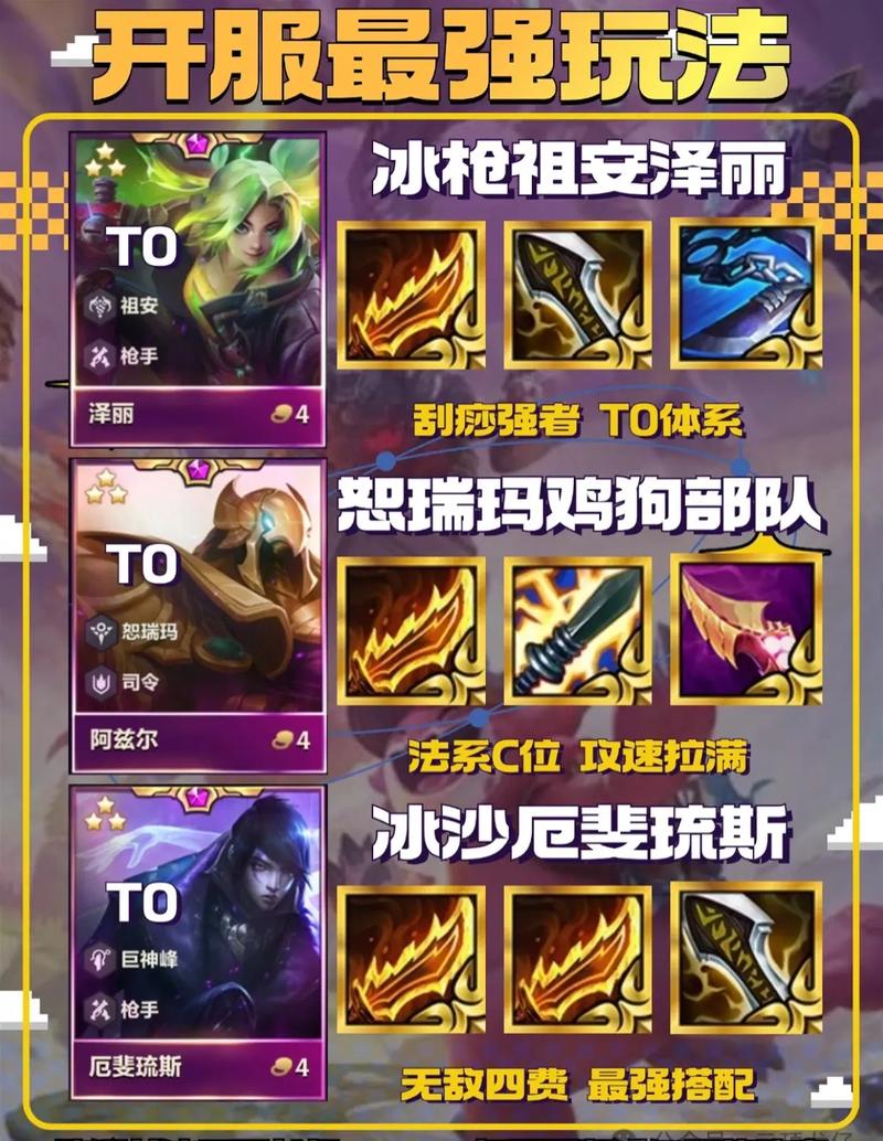 〖Five〗、金铲铲S9符文大陆推荐阵容如下:高爆发输出型阵容皮城祖安枪:以四枪手为核心,泽丽作为主C,中期通过霸龙+金克斯拿装备过渡,节奏紧凑,4-1阶段升至七级后D牌强化阵容。六法拉克丝:依赖法转开启六法师羁绊,7级即可成型,法师中低费卡多,过渡平滑。