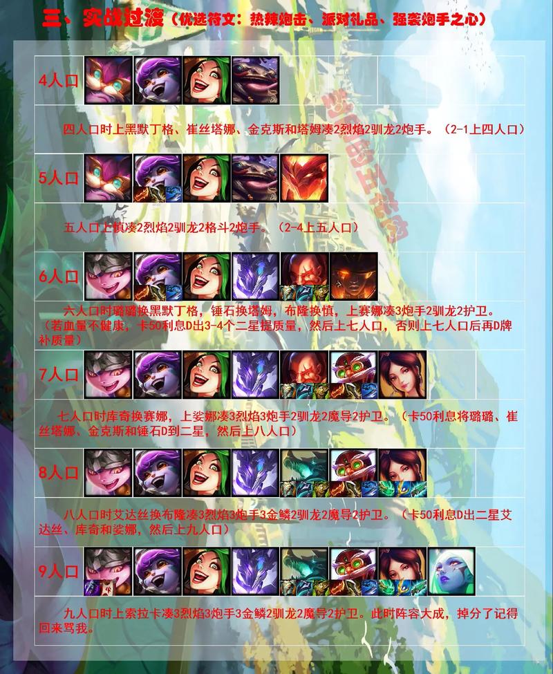 建议优先级抢金铲,大剑,眼泪,大棒,攻速,腰带 前期开3星界龙和2驯龙养蛙妃,前期瑞兹青龙刀,前排传送门越多越好,打连胜,瑞兹装备靠秘宝龙补齐。中期补法师羁绊,找塞拉斯,莉莉娅,流浪和冰鸟。升人口找佐伊和巴德并提升质量即可。