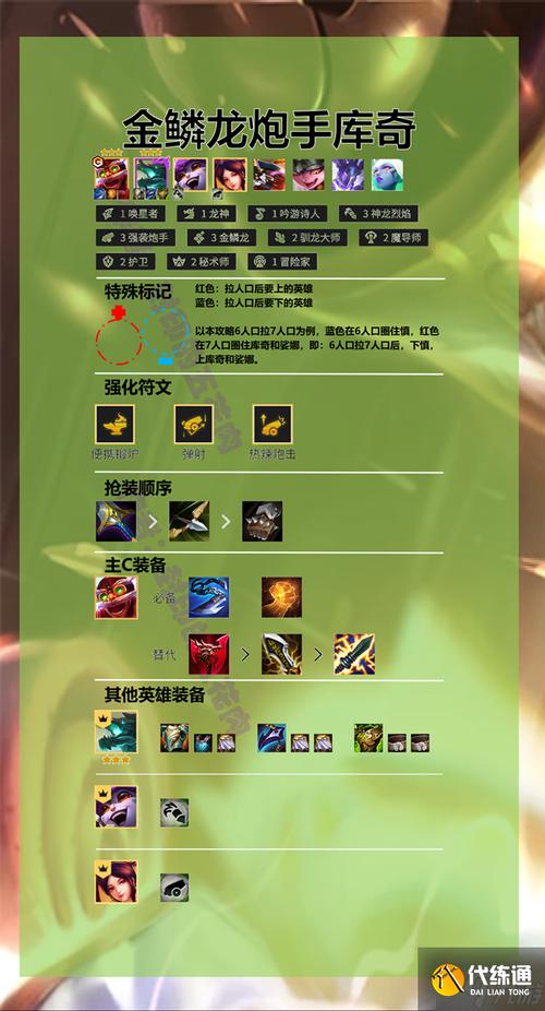 核心装备配置潜龙刺(阿卡丽)主C三件套为火炮、无尽、饮血。火炮可避免阿卡丽因攻击距离不足而“假赛”,提升容错率;无尽是核心输出装,时空裂痕版本刺客羁绊提供高暴击伤害加成,无尽可将其暴击几率补满至100%,最大化输出效率;饮血提供续航能力,刺客的高爆发伤害能转化为大量血量回复。