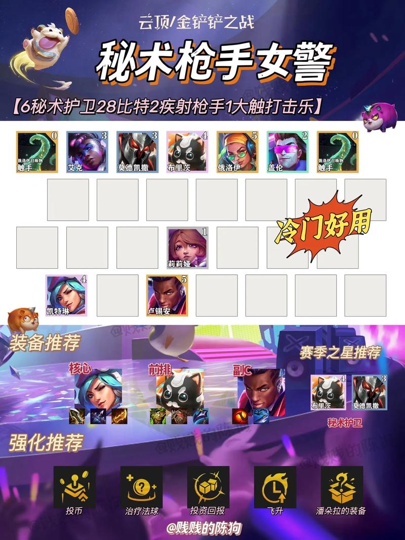 〖Five〗、艾尼维亚:禁忌之塔、日炎斗篷 金克斯:狙击之眼、统御全场 上述四种阵容在当前金铲铲之战:双城之战的版本中相对较为强势,但玩家应根据实际对局情况进行灵活调整。掌握英雄定位与装备匹配是至关重要的,只有不断实践并结合战术变化,才能在多变的竞技场中取得最终的胜利。