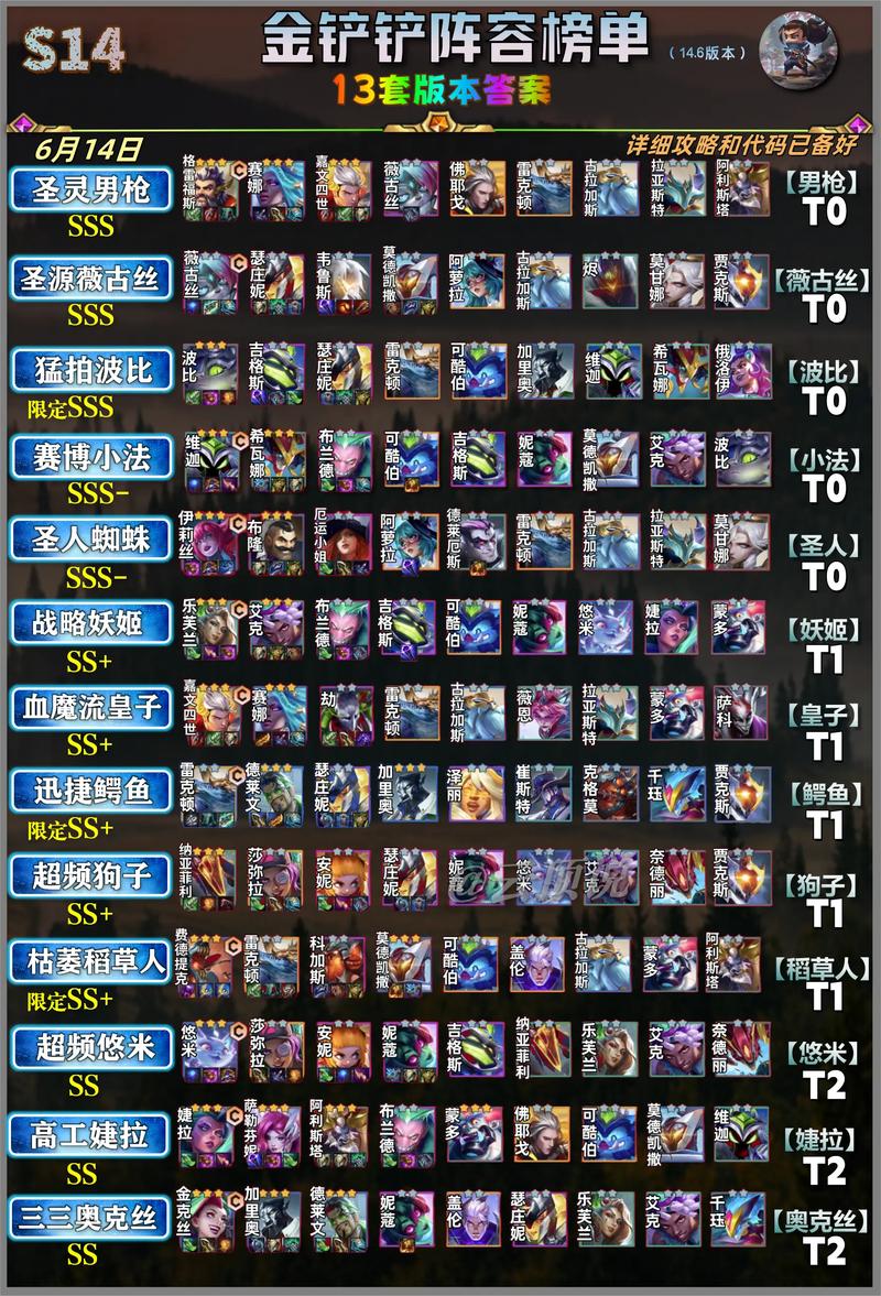金铲铲之战手游中,T0级别的阵容搭配有以下几种:六骑天使阵容 该阵容以骑士羁绊为核心,搭配天使的高输出能力。主要成员包括盖伦、贾克斯、波比、蕾欧娜、诺克萨斯之手、凯尔(天使)等。通过骑士的坦度和天使的真实伤害,能够在战斗中稳定输出,对敌方造成巨大威胁。