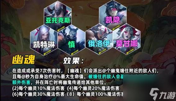 一共有7个角色,羁绊效果直接增加了法术的攻击效果,而且还和S5赛季的法师羁绊相似,友军的释放技能也可以继续增加攻击力和法强的叠加效果。8个棋子属于全能型大羁绊,羁绊效果在半血后获得①高伤害减免提升坦度,②提高50%的血量,③每秒的血量,提高输出能力。