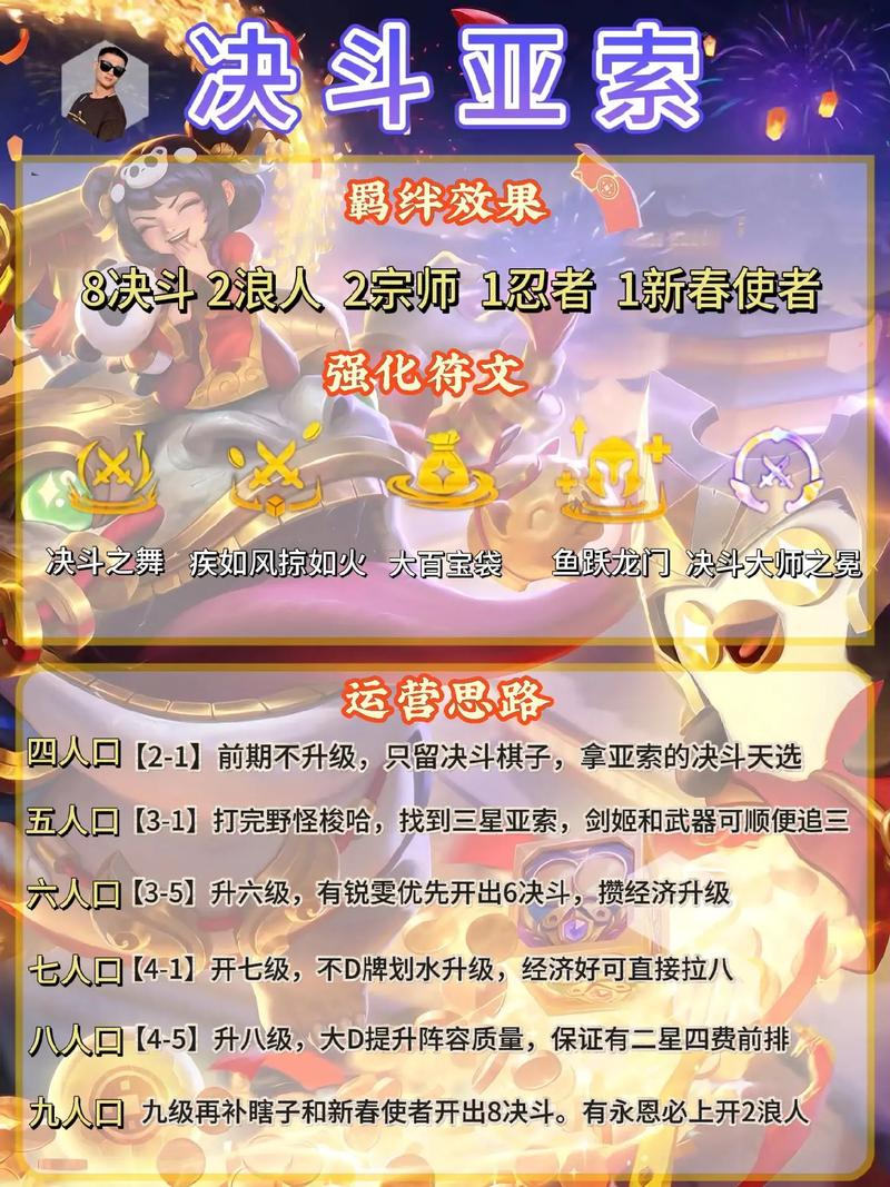《金铲铲之战》S5超级英雄亚索阵容攻略 阵容组成与羁绊核心阵容:普朗克、亚索、李青、墨菲特、菲奥娜、尼菈、费德提克、厄加特。羁绊效果:3超级英雄(提供额外伤害加成)+4/6/8决斗大师(攻速与减伤)+2怪兽(控制与输出)。转职推荐:决斗纹章(优先给安妮,触发2福牛羁绊,获得一次免疫伤害效果)。