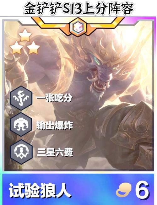 在金铲铲之战s13赛季中,全新上线的六费卡为玩家们带来了更加丰富的策略选取。以下是新增的六费卡的详细介绍:狼人 被动技能:在嗜血期间,狼人的移动速度会更快,并获得吸血和攻速加成,每秒对目标造成额外物理伤害。在击杀一名敌人后,狼人将进入不可阻挡和嗜血状态,该状态将持续至战斗环节结束。