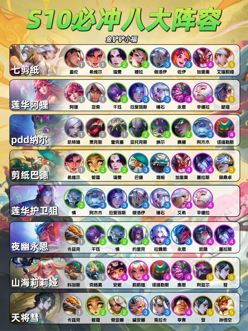 〖Four〗、《金铲铲之战》新赛季最强阵容搭配推荐奥恩六法阵容、巨神峰厄加特阵容、术士大眼阵容阵容、祖安皮城枪阵容、神谕卡尔玛阵容,具体如下:奥恩六法阵容 阵容组成 拉克丝+维克兹+娑娜+斯维因+嘉文四世+塔里克+玛尔扎哈+奥莉安娜。阵容羁绊 8法师(需要法师转职)+3德玛西亚+2术士+2司令。