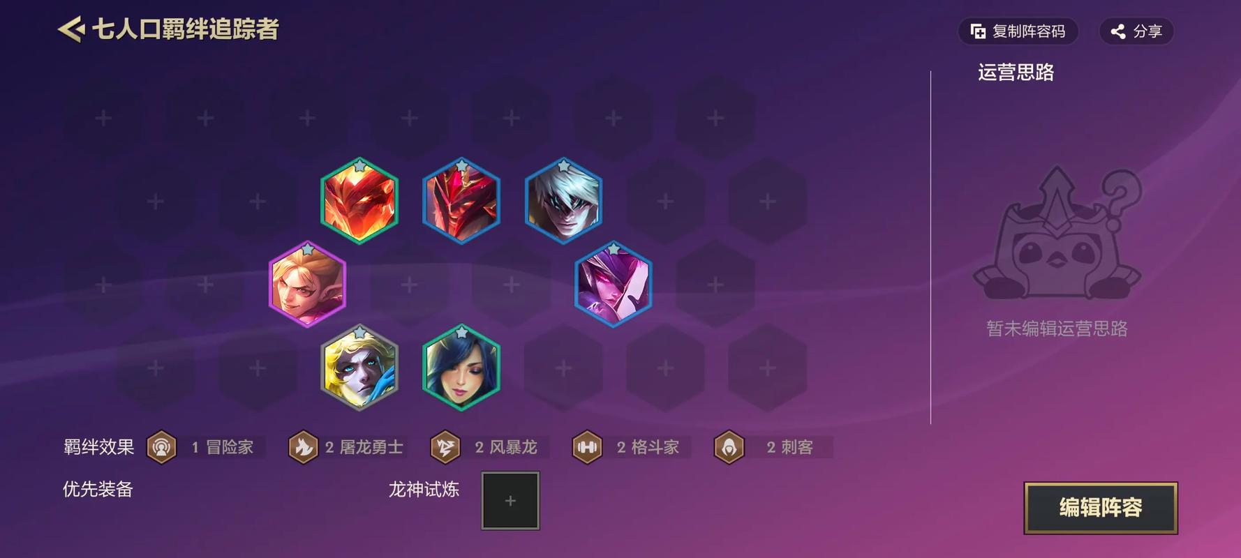 〖One〗、优先选取低费多羁绊棋子 为了更快地凑齐8个不同的羁绊,玩家应优先选取那些费用较低且能触发多个羁绊的棋子。这些棋子通常更容易在前期获得,有助于玩家更快地构建出所需的羁绊组合。运营思路 在游戏前期,玩家需要预留2~3个重铸器或潘多拉装备,以避免纹章与阵容产生冲突。
