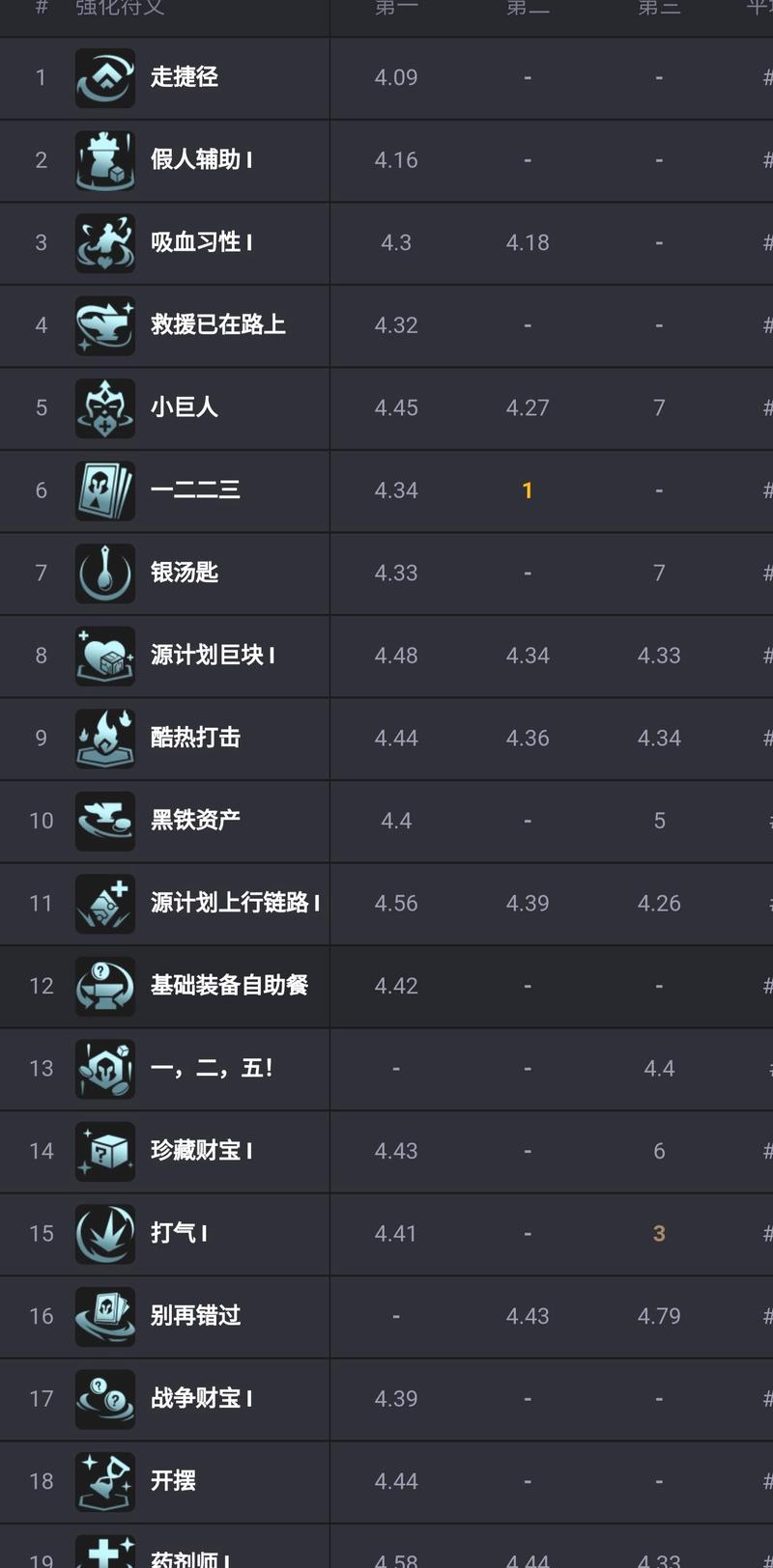 金铲铲之战s13白银阶的强化符文主要包括以下十个:假装摸鱼:效果:在下面的数个回合里无法采取任何行动,但会获得多个[成装锻造器]。假人化:效果:失去场上和备战席上的所有弃子,获得1个[训练假人],其生命值为失去所有弈子的总生命值的80%(数值可能有误,原文为809%6,应为笔误)。
