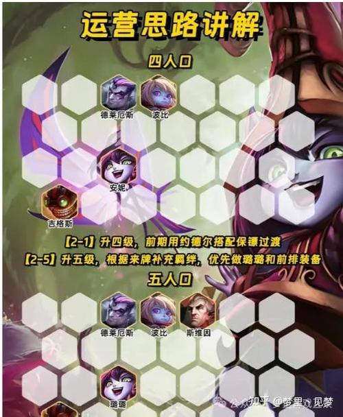 阵容搭配 核心成员包括蚂蚱、发条、乌鸦、宝石、卡尔玛、大眼、希尔科、慎、阿狸,形成6法师、2艾欧尼亚、2堡垒、2神谕的羁绊组合。推荐英雄传说之力 女警:为了快速拿到金色的第一个天生两星,可以开局升4级寻找2星乌鸦以打连胜。