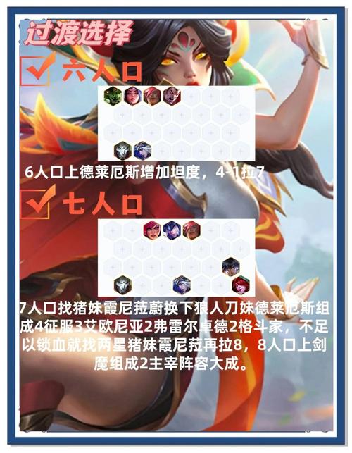 金铲铲之战冒险刀霞的玩法主要包括以下要点:羁绊组合:核心羁绊为3怒翼、3冒险、2刺客、2射手、2格斗、2中期、2狂刃和2风暴。9人口时可获得橙色卡,并根据海克斯和转移情况调整阵容,可单独挂亚索、巴德和龙女。C位霞的装备推荐:主要装备为羊刀和巨杀或杀人剑。羊刀提供攻速加成,巨杀或杀人剑则增强输出能力。