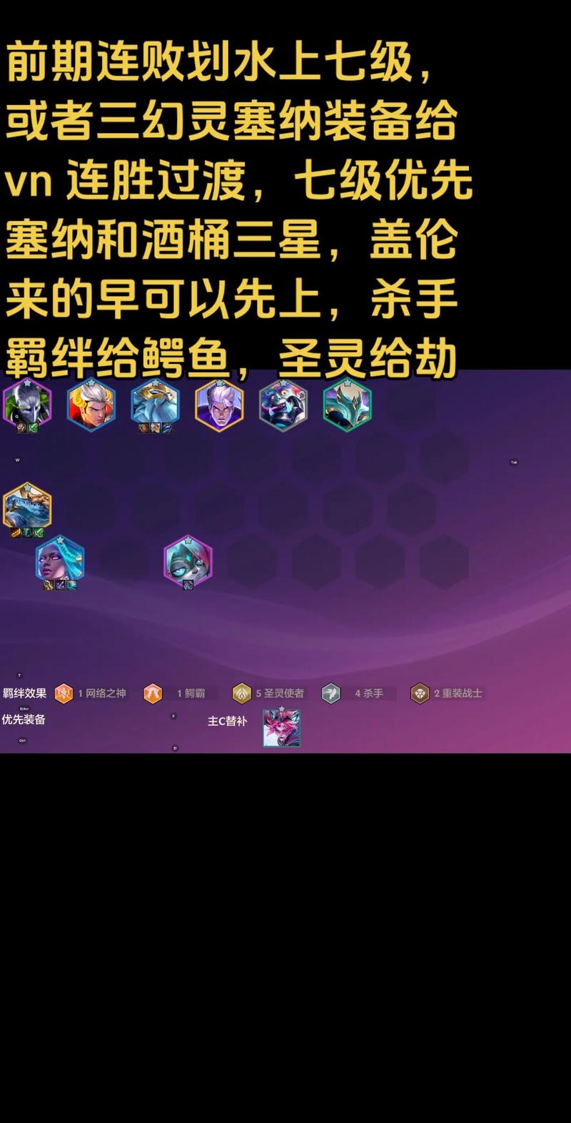 〖Two〗、第一种:使用VN开3幻灵过渡,或大嘴开2迅捷2战地过渡,尽量保证高血量在7人口慢搜三星。第二种:连败执事过渡,塞纳和劫是通用卡,根据D牌情况灵活转阵容,塞纳多则转圣灵塞纳,德莱文多则转堡垒德莱文。
