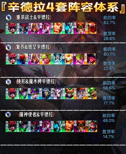 〖Two〗、第一类是T1级别阵容,其中术士提莫与裁决潜行劫尤为突出,凭借其版本强势与综合胜率,成为最热门的选取。而T5级别的阵容包括主宰盖伦、斗士挖掘机、主宰狼人与神谕者卡尔玛,这些阵容在运气好的情况下能获得显著优势,但也有明显的弱点。