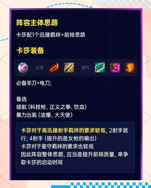 金铲铲之战拼多多卡莎玩法概览 阵容搭配:羁绊组成:3幻灵战队、3星之守护者、2淘气包、2情报特工、2斗士、2决斗大师、1气象主播、1平民英雄。强化符文推荐:羁绊类如幻灵战士之徽、淘气包之徽;战力类如并肩作战、珠光莲花、公理圆弧。英雄强化推荐拿卡莎、猪妹的强化符文。