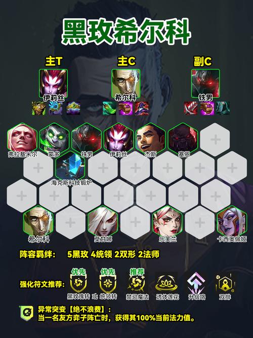 〖Four〗、金铲铲之战中海克斯希维尔的上手玩法主要包括以下几点:角色选取与羁绊搭配:核心角色:希维尔、纳尔、蔚、猪妹、皇子等,以及乌鸦。羁绊选取:主要选取宿敌、海克斯、强袭战士和格斗等羁绊。其中,海克斯之徽、新星和科技前线是关键的羁绊选取。
