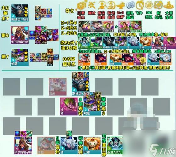 乌鸦、奶妈、宝石、拉克丝、阿狸、皇子、大眼、蚂蚱、发条是这套阵容的核心角色。乌鸦提供控制,奶妈保证队伍生存,宝石和拉克丝加强输出,阿狸和皇子增强控制,大眼和发条则提供强大的输出能力。羁绊效果 这套阵容拥有8法师和2巨神峰、2司令的羁绊。