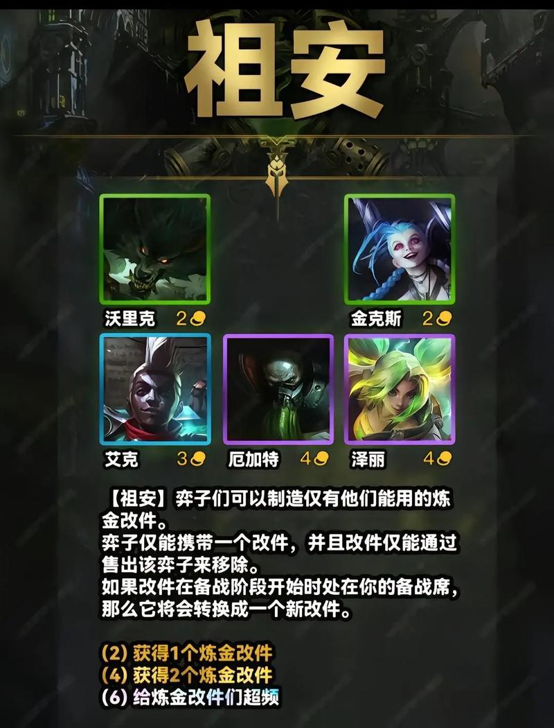 推荐阵容如下:沃里克、丽桑卓、蒙多、扎克、悠米、奎因、维克托、拉克丝。其中,沃里克作为关键角色,装备应优先选取水银、巨人杀手和无尽之刃,以提升其生存能力和输出能力。羁绊搭配:此阵容包含1猫猫、5炼金科技、2战斗学院、2黑魔法师、2格斗家、2挑战者、2学者。
