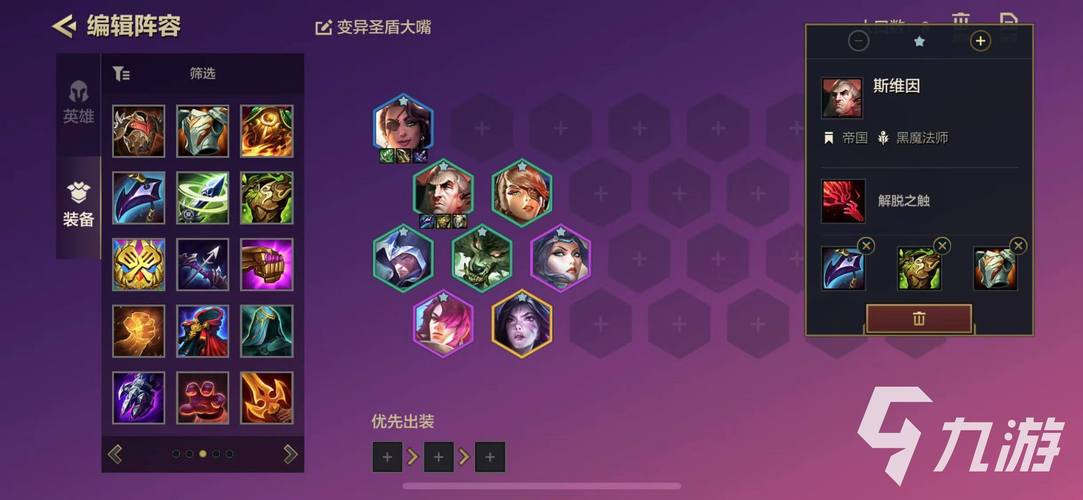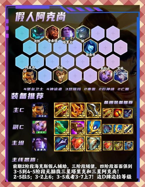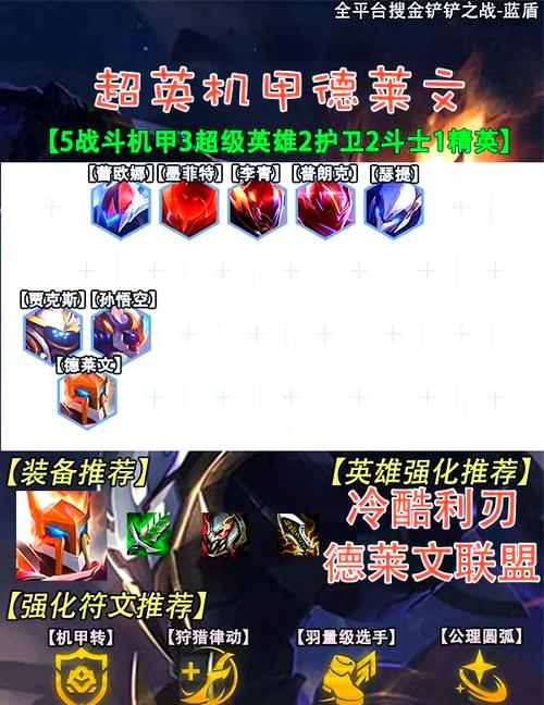 〖Six〗、德莱文作为四骑士三剑士二帝国阵容的核心,拥有极强的输出能力。成型后的阵容异常强大,德莱文的输出效果惊人。在游戏初期,推荐使用2骑士3神将2游侠开局,选秀时优先抢攻速、大剑和拳头装备,利用脆弱的坦克角色来防止机器人的钩击,攻击装优先给天罚弩神,防御装则给不屈战神,以此过渡。
