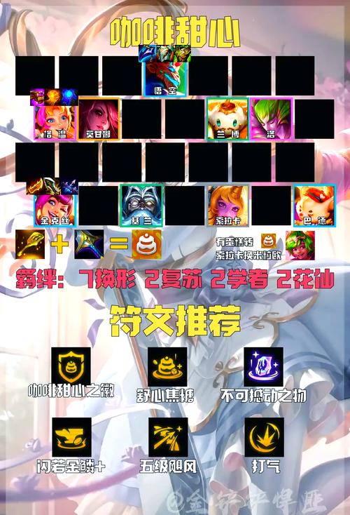 〖Four〗、前排英雄:洛、剑姬、莫甘娜、卡特。 中排英雄:莉莉娅、萨勒芬妮、巴德。 后排英雄:丁真、滑板鞋。羁绊搭配 - 6花仙:以洛、莉莉娅、萨勒芬妮为主,强化群体伤害和控制。- 2狂暴战士:增加剑姬和卡特的攻击力,提升输出能力。- 3复苏:部分英雄拥有复活效果,增强持续作战能力。