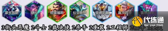 〖Two〗、阵容推荐:沙皇、狗头、拉克丝、皇子、盖伦、斯维因、提莫、岩雀,组成羁绊为4司令、3恕瑞玛、3德玛。 强化符文选取:首选潘多拉的装备、鲜血转换、部分飞升;次选战斗准备源计划巨块2。