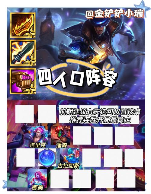 〖Five〗、其他羁绊:如超级粉丝等,可增强赛季之星或提供额外装备和效果。装备推荐 主C卡特:法爆、正义。备选装备包括帽子、大天使等法装。其他装备:根据阵容需要,为其他英雄配备合适的装备,如前排坦克装备、控制装备等。